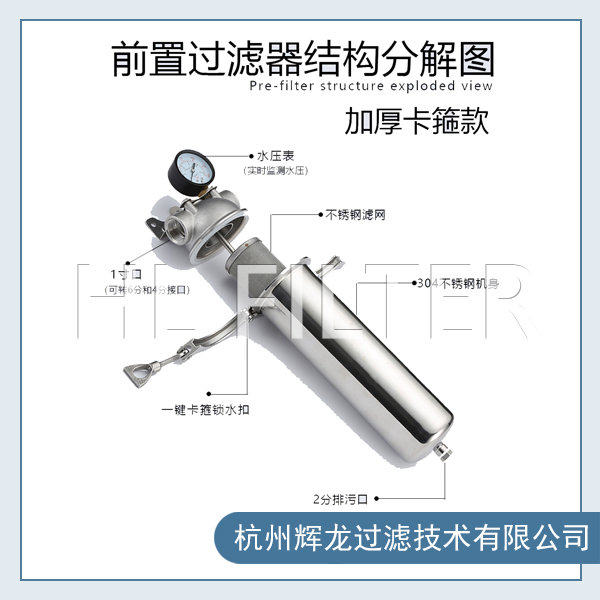 前置過濾器通常為“T”型結構。上面的“一橫”的位置左右兩端分別為進出水口。下面的“一豎”位置為機身和內部的筒形過濾網,最下端則為排污口,靠一個閥門來控制開啟和關閉。濾網的...